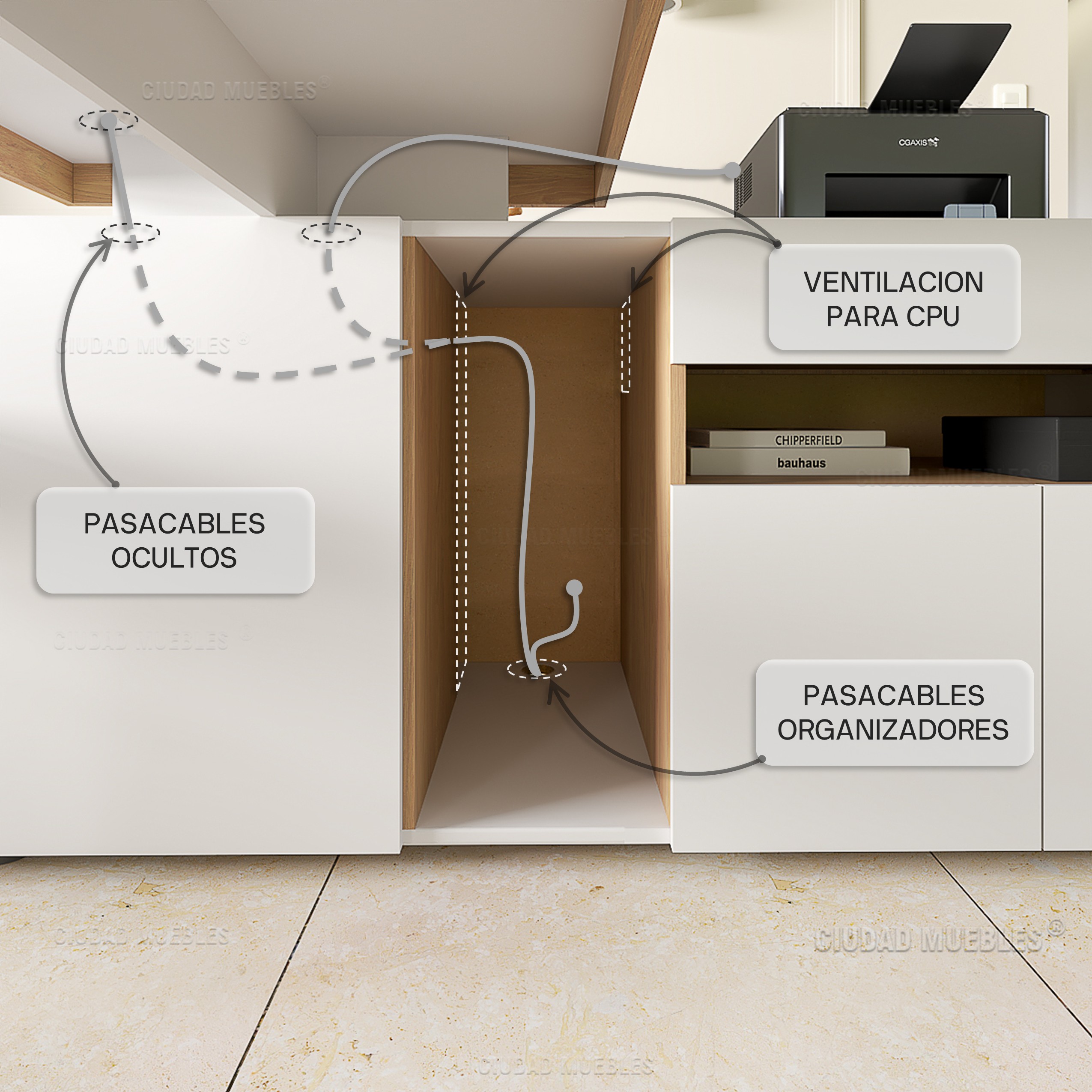 – RESPIRO INTELIGENTE: El espacio para la CPU cuenta con aberturas laterales estratégicas para asegurar una ventilación óptima, previniendo el sobrecalentamiento del equipo y garantizando un rendimiento continuo y sin interrupciones.