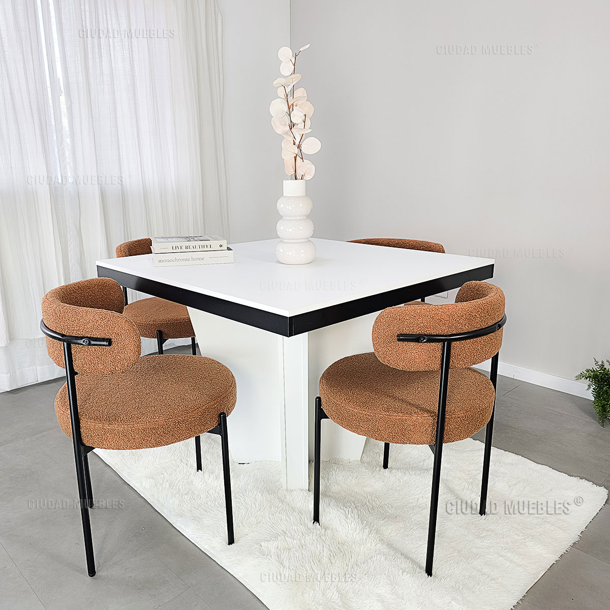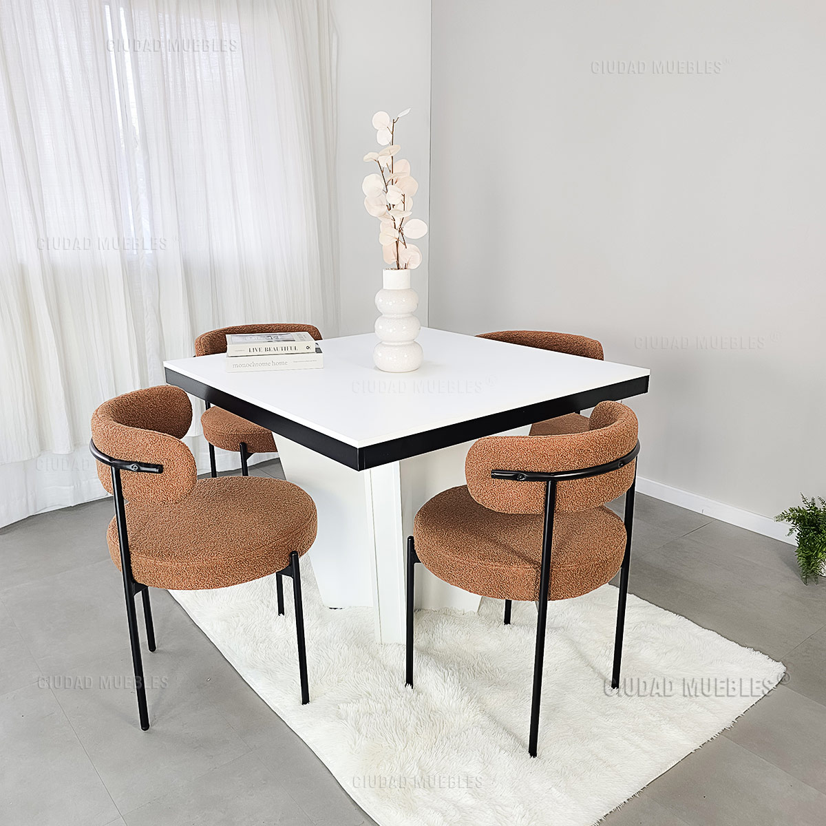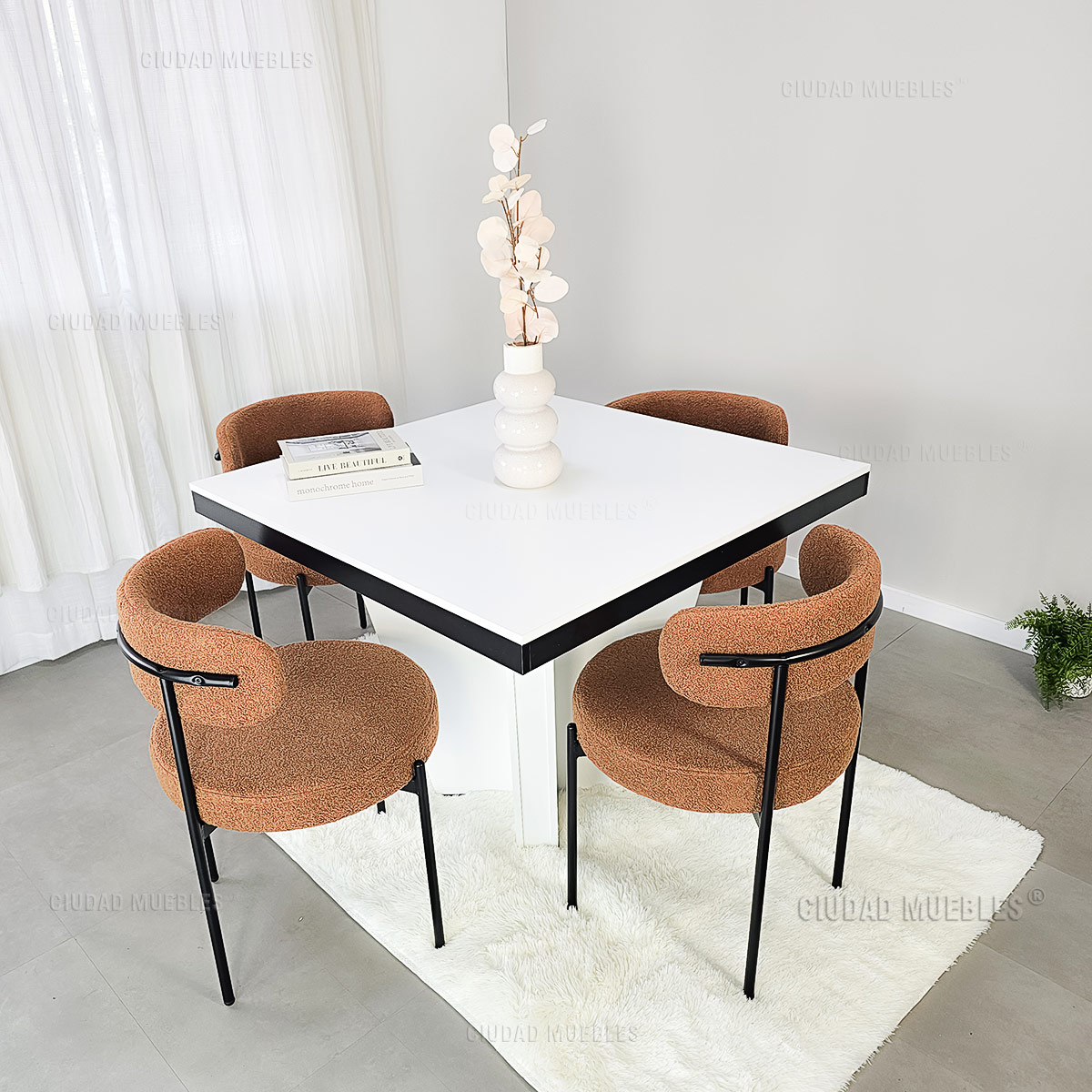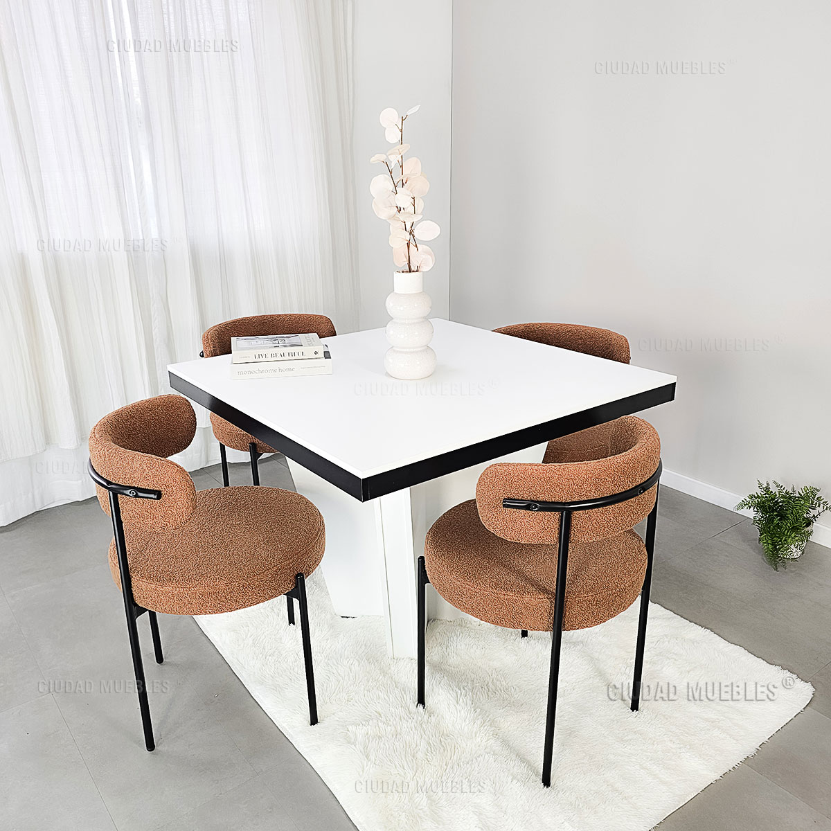 JUEGO DE COMEDOR PARA 4 PERSONAS DE SILLAS EN TELA BOUCLE + MESA DE COMEDOR CUADRADA 100 x 100 CM