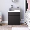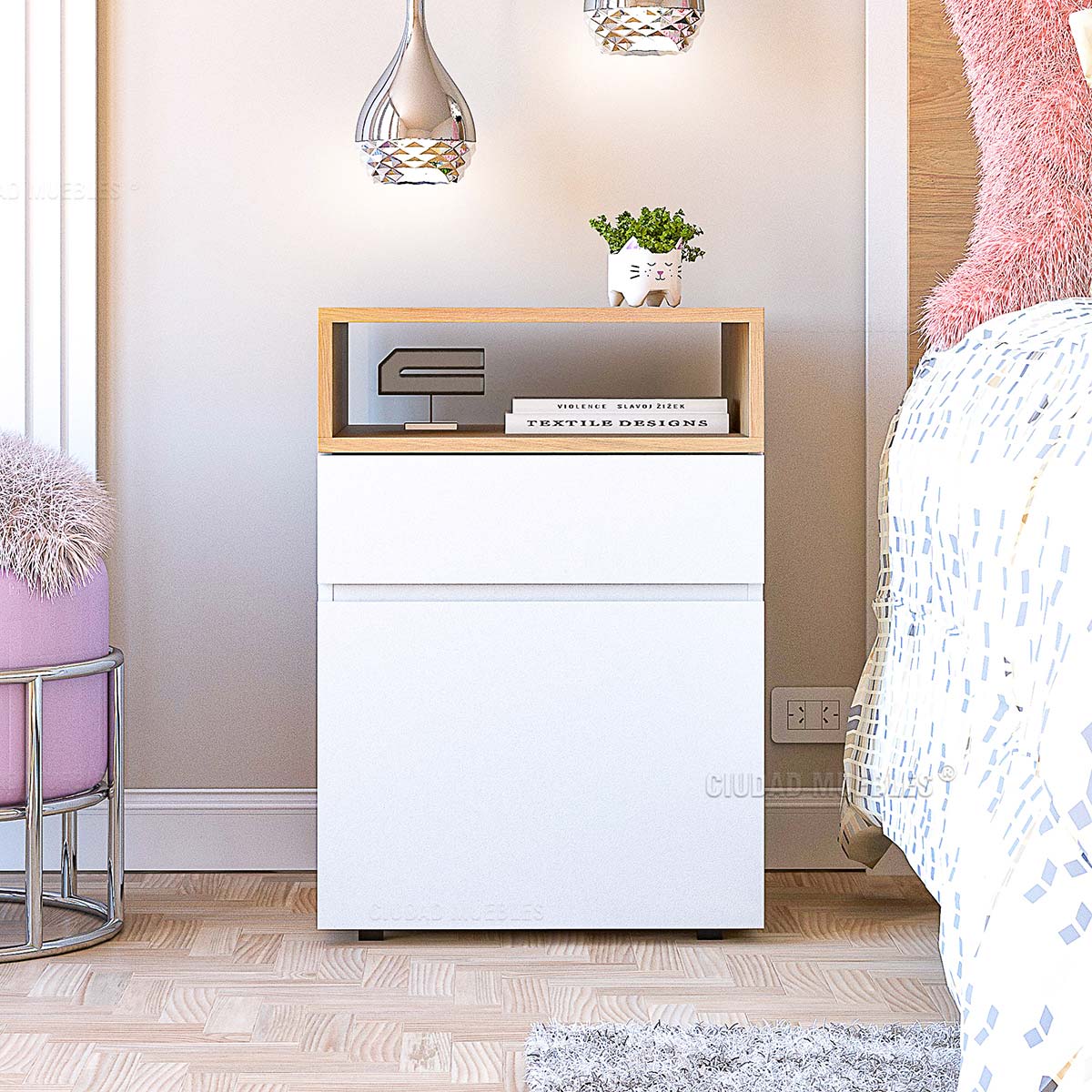Cuenta con un estante abierto en la parte superior, un cajón de fácil apertura y una puerta. Permite el guardado de distintos tipos de objetos personales. El interior del cajón tiene fondo en fibroplus blanco y está recubierto en melamina blanca.